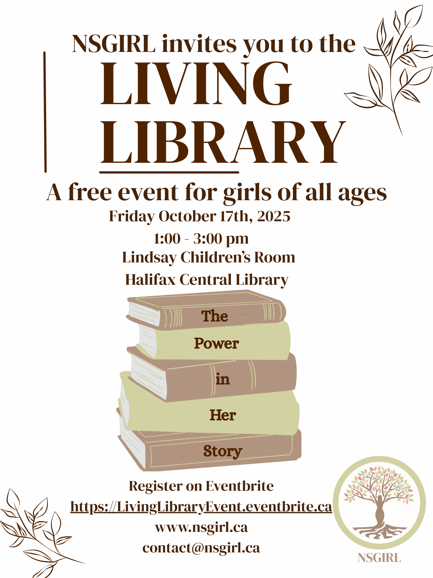 NSGIRL will be holding a living library event at the Halifax Central Library on October 17th from 1-3:00 pm. It is an event for girls and gender diverse youth in celebration on the International Day of the Girl Child.